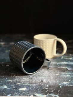 Zestaw dwóch niedużych kubków w czerni i bieli. Uroczy zestaw dla przeciwnych charakterów. Ulepione ręcznie z jasnokremowej gliny, poszkliwione czarnym i białym szkliwem, na zewnątrz - matowymi, wewnątrz - błyszczącymi. Wypalone w temperaturze powyżej 1200 stopni, można myć w zmywarce. Wymiary: wysokość 7 cm; średnica 8 cm, wymiary ucha: szerokość 4 cm. Pojemność 220 ml.