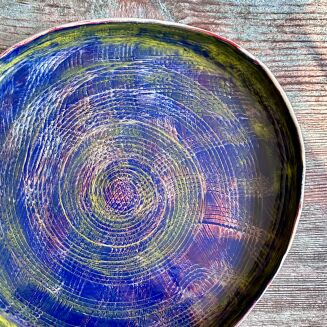 Ceramiczny duży talerz, ulepiony ręcznie z jasnej gliny, z niezwykłym, oryginalnym, wielokolorowym wzorem, w kolorach kobaltowym, żółtym, czerwonym, przenikającym i przecinającym się. Poszkliwiony i wypalony w temperaturze powyżej 1200 stopni. Można myć w zmywarce. Kształt nieregularny. Średnica 24-26 cm, wysokość 2,5 cm. Produkt wprowadzony do sprzedaży przed dniem 13.12.2024r.